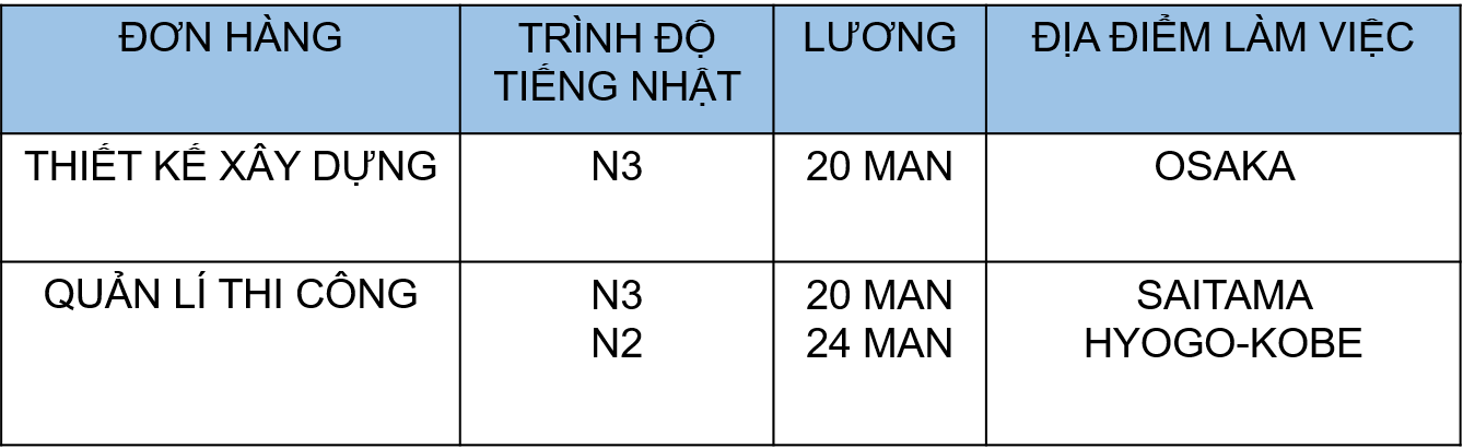 Ngành xây dựng ở Nhật lượng công việc khá đa dạng, có đến 70% đơn hàng xây dựng Nhật Bản là làm việc ngoài trời như giàn giáo, bê tông, buộc thép,… 30% còn lại làm việc trong nhà như thi công nội thất, đường nước, điện, bả sơn,….