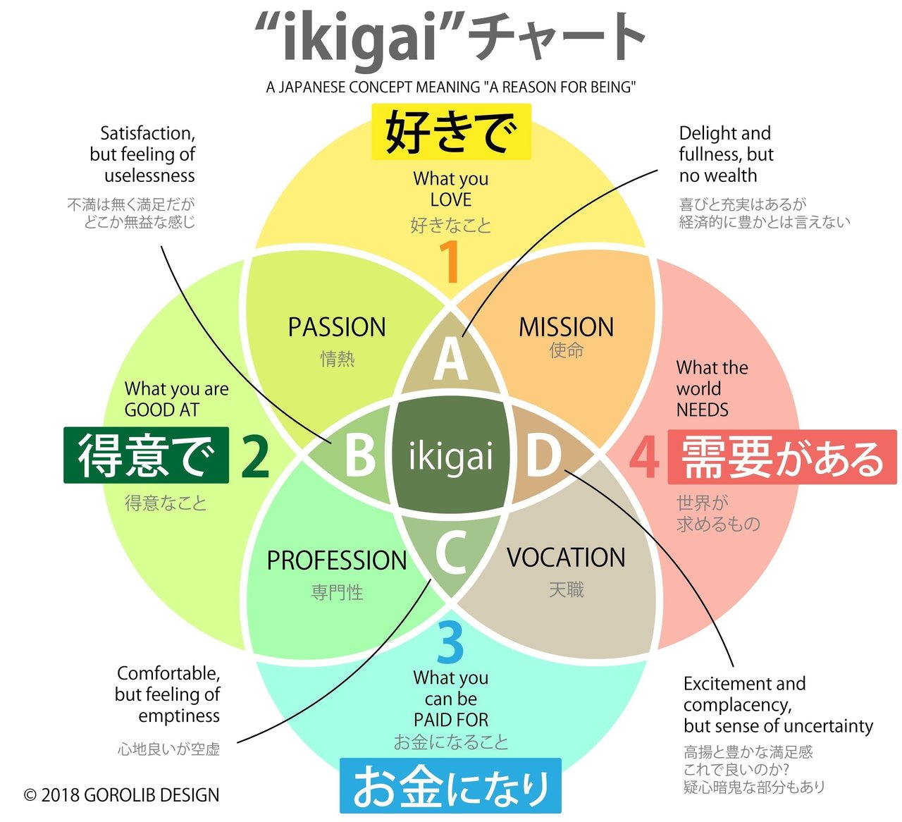 Ikigai thường được biểu thị bằng biểu đồ Venn có bốn vòng tròn: