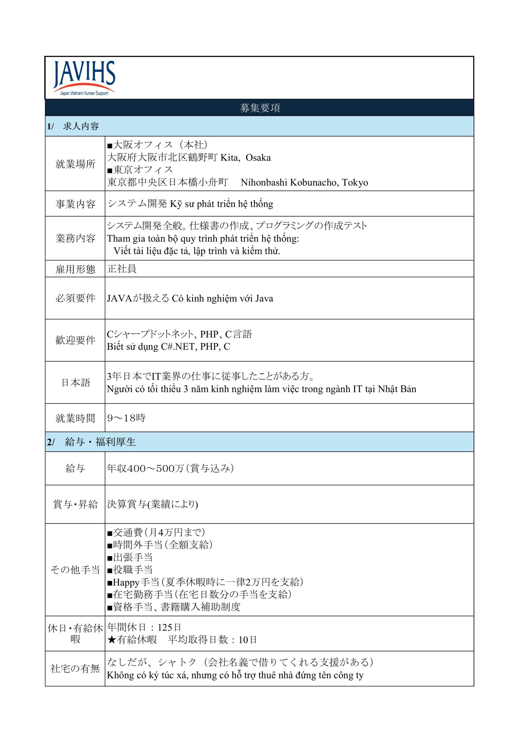 JOB IT PHÁT TRIỂN HỆ THỐNG OSAKA/TOKYO NENSYU 400-500 MAN