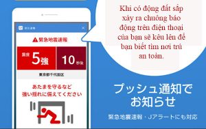 Nhật Bản là một trong những nước có động đất xảy ra nhiều nhất trên thế giới, và đặc biệt trận động đất lịch sử xảy ra năm 2011 đã kèm theo sóng thần gây thiệt hại nặng nề về người và của. Ngoài ra nó đã gây ra sự cố hạt nhân ở Nhà máy điện Fukushima… đã làm trấn động cả thế giới. Khi có động đất sắp xảy ra chuông báo động trên điện thoại của bạn sẽ kêu lên để bạn biết tìm nơi trú an toàn.