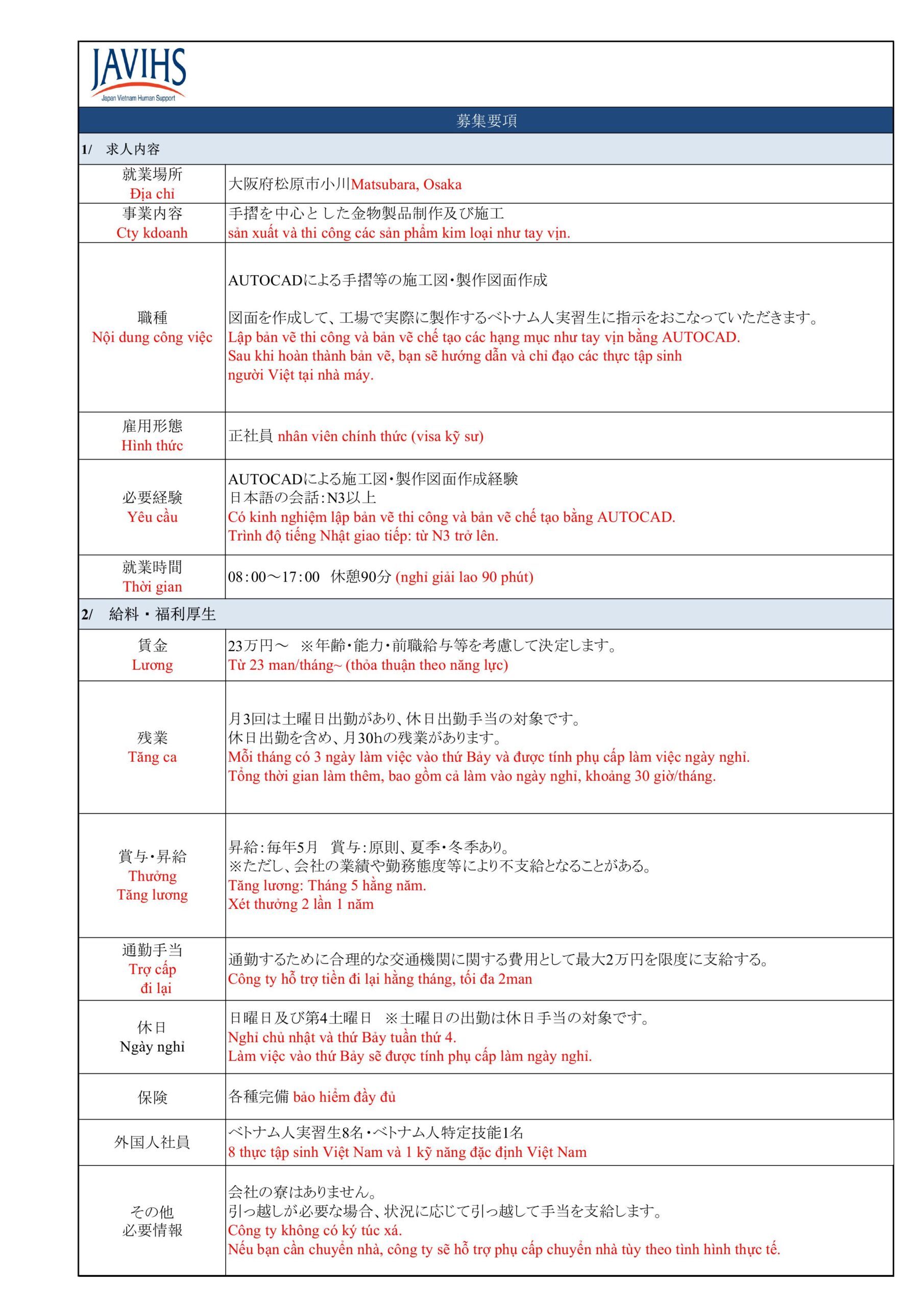CV ứng tuyển qua mail : rirekisho.javihs@gmail.com