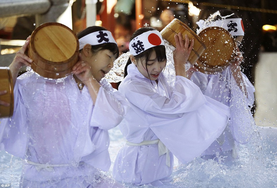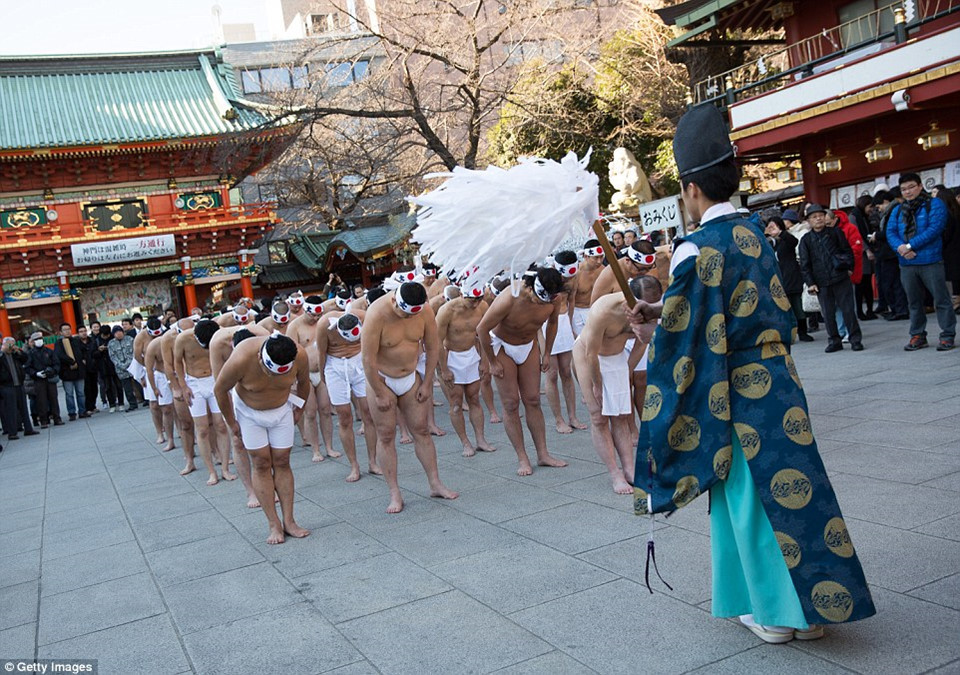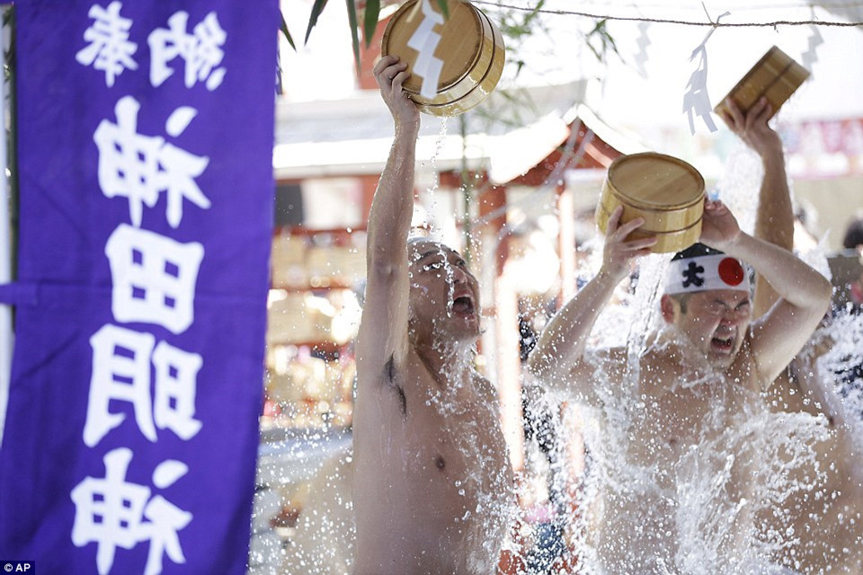 Nghi lễ tắm nước đá tại đền Kanda Myojin, Tokyo có sự tham gia của hơn 100 người cả nam lẫn nữ. Nghi lễ được cho là giúp thanh tẩy tâm hồn và mang lại may mắn.