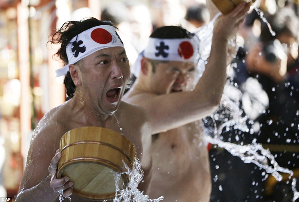 Những người đàn ông dội nước đá lên mình với niềm tin thanh tẩy tâm hồn và mang lại may mắn. Tắm nước đá là một trong nhiều hoạt động cầu phúc, lộc, tài trong năm mới của người Nhậtt. Ảnh: AP.